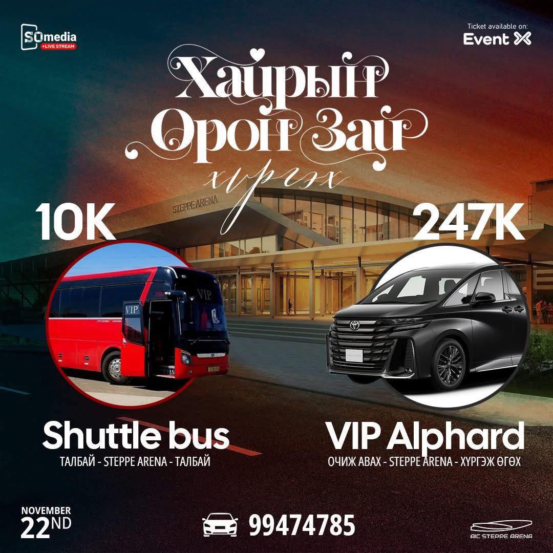 2025.11.22-нд AIC STEPPE ARENA-д болох Бундын Тамга хамтлагийн Хайрын Орон Зай тоглолтод хүргэх тээврийн үйлчилгээтэй боллоо