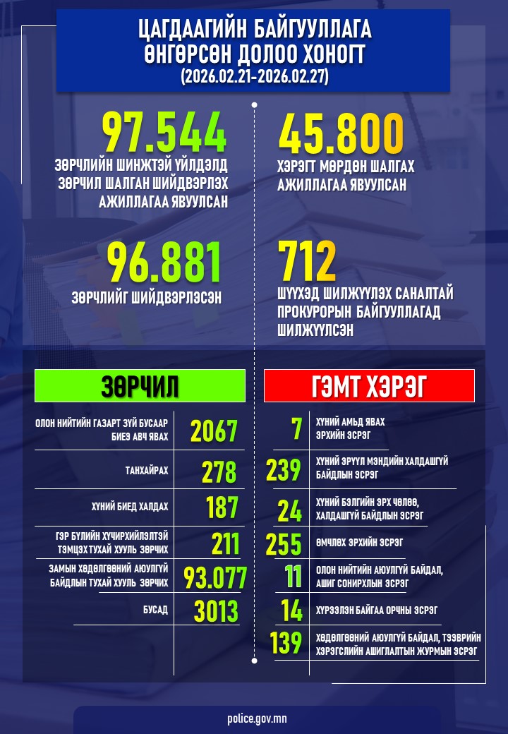Зөрчлийн шинжтэй 97.544 үйлдэлд зөрчил шалган шийдвэрлэх ажиллагаа явуулж, 96.881 зөрчлийг шийдвэрлэсэн байна.